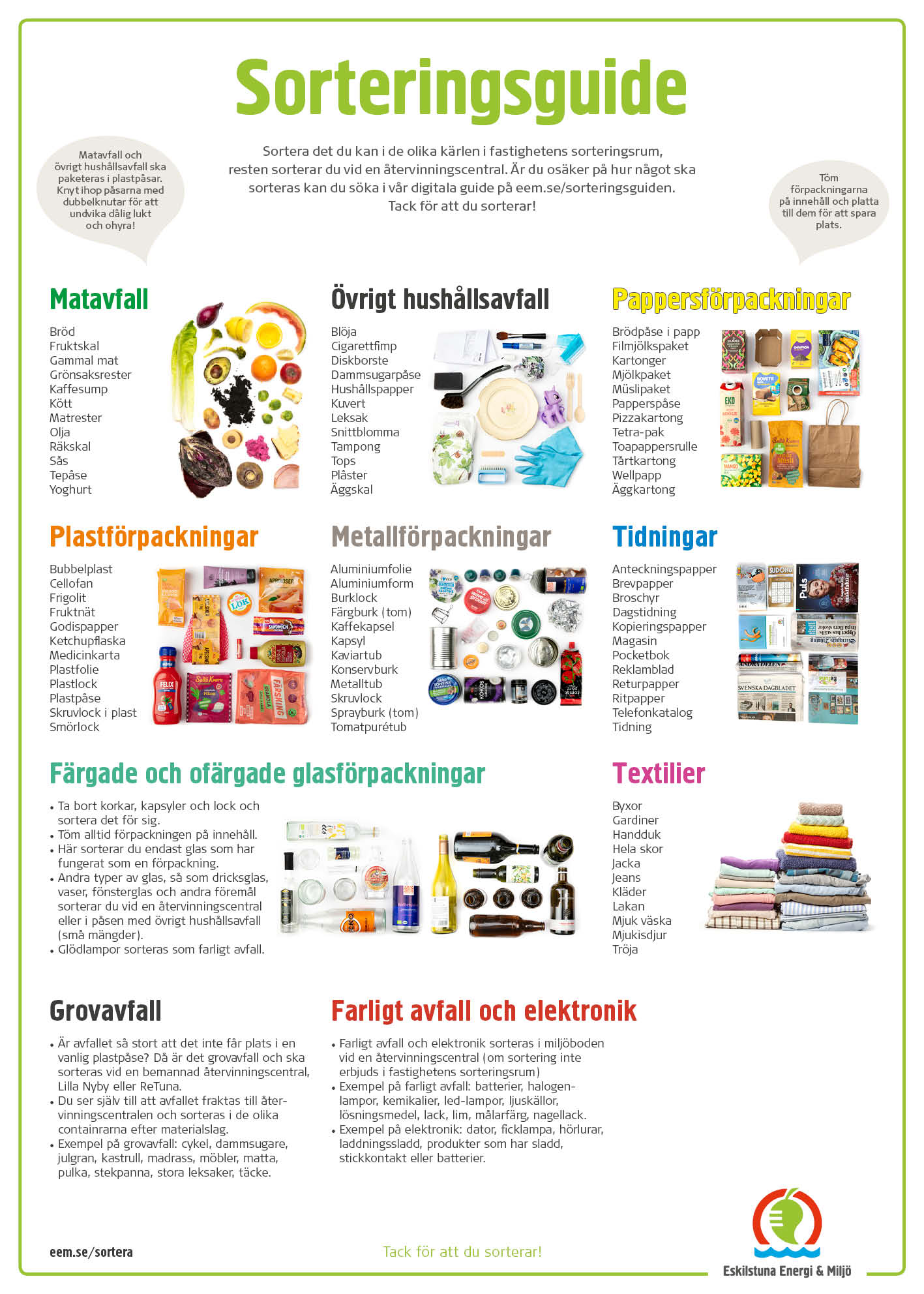 Vi hjälper dig att informera dina hyresgäster om hur de ska sortera i soprummet. Här hittar du informationsmaterial som du kan ladda ner, skriv ut och dela ut.