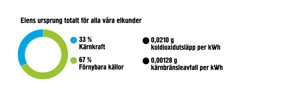När du köper el av oss får du välja hur du vill att elen ska vara producerad, det gör du genom valet av elavtal och tillval. Här redovisar vi ursprunget av den el som vi levererar hem till dig.