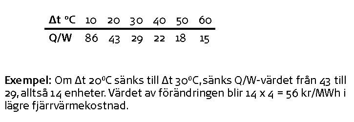 Ju bättre avkylning av fjärrvärmevatten du har, desto mer flödesrabatt får du. Tabellen nedan visar hur ditt Q/W-värde sänks i förhållande till avkylningen (Δt).