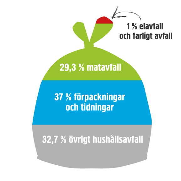 Endast en tredjedel av det som slängs i påsen för övrigt hushållsavfall är sådant som ska vara där. Resterande två tredjedelar är värdefullt material som hade kunnat återvinnas om det sorterats rätt. Har du koll på vad som finns i din påse?