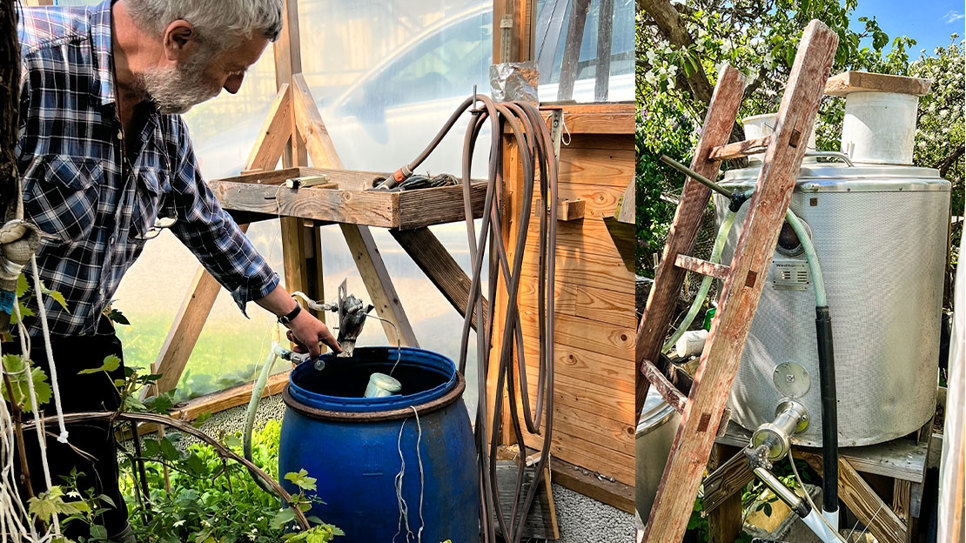 Det doftar bastu inne i växthuset, virket är senvuxen fura från hustrun Ingrids släktgård i Lappland. Intill ingången står en blå 100 liters-tunna. Det regnvatten som landar på garagets tak leds ner genom underjordiska rör och hamnar i tunnan.